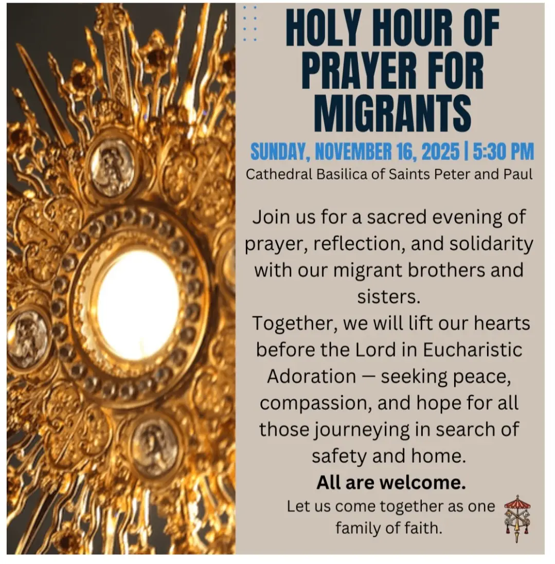 - Sunday November 16 at 5:30PM at the Cathedral Basilica of Saints Peter and Paul. Holy Hour for Immigrants (followed by the 6:30PM Mass). Flyer is here.