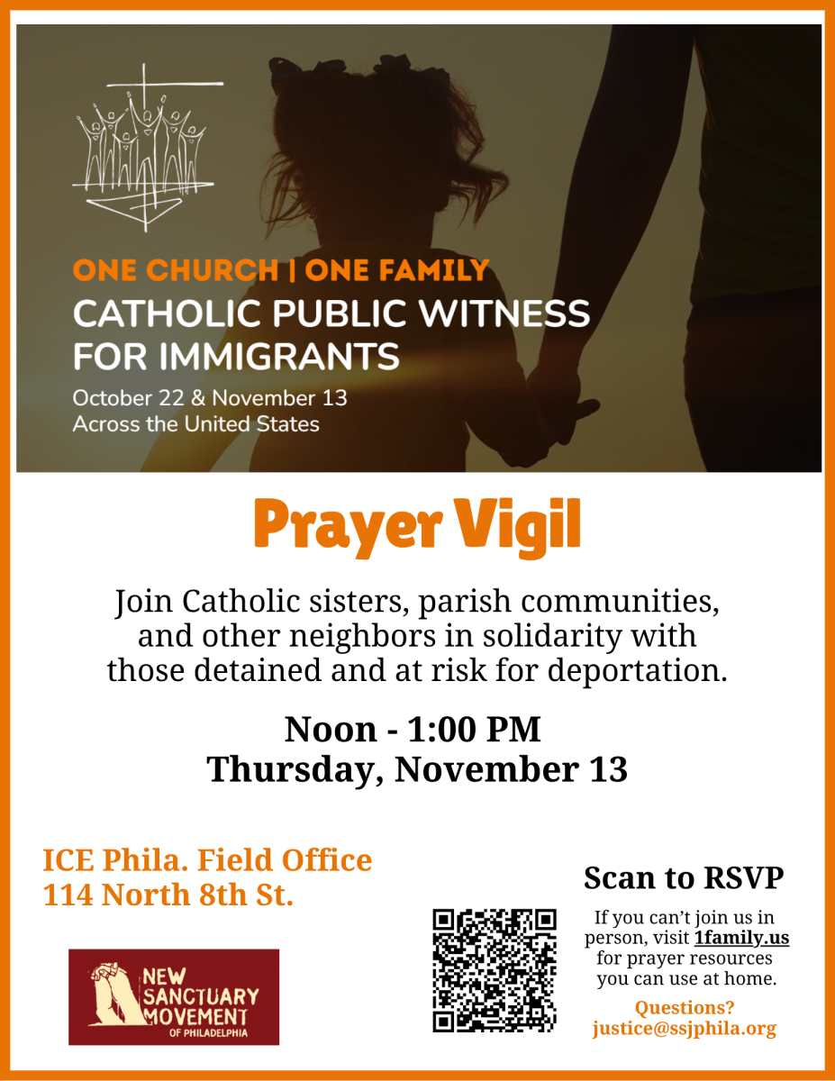 - Thursday November 13 from 12-1PM outside the Philadelphia ICE field office at 114 N 8th St, Philadelphia, PA 19107- Prayer Vigil for immigrants. Flyer is here. Registration is here. All are welcome.