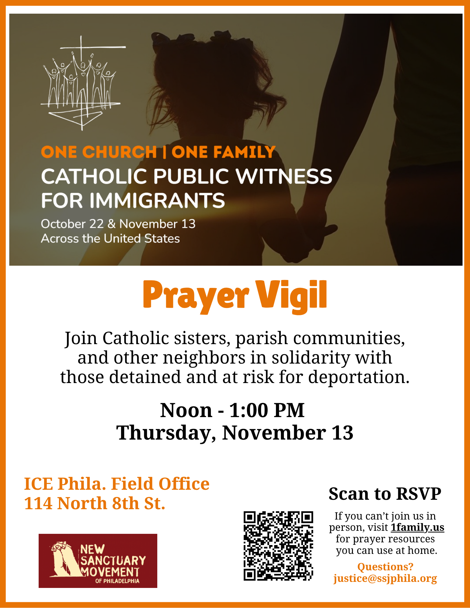 - Thursday November 13 from 12-1PM outside the Philadelphia ICE field office at 114 N 8th St, Philadelphia, PA 19107- Prayer Vigil for immigrants. Flyer is here. Registration is here. All are welcome.